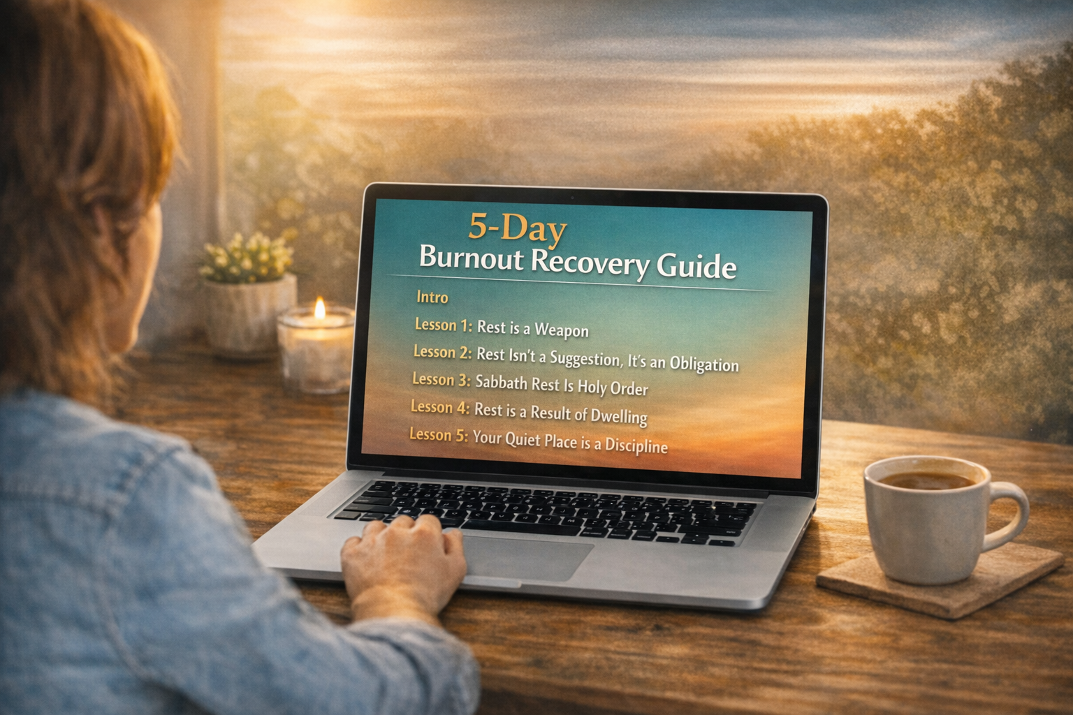 The 5-Day Burnout Recovery Plan helps you begin a sustainable rhythm of rest so you can start your process of recovery without having to wait for a vacation to feel restored. In five short lessons, you will learn how to interrupt constant motion, create boundaries that protect recovery, practice Sabbath rhythm, and develop a quiet-place discipline that strengthens clarity, peace, and emotional capacity in everyday life.